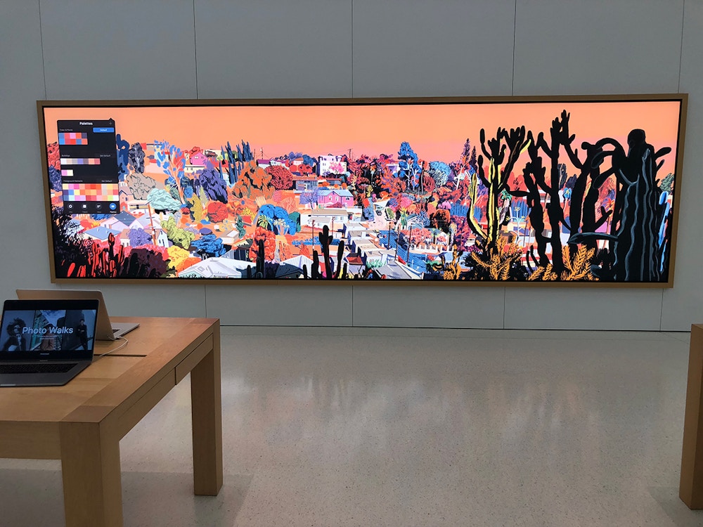 Drawn on an iPad during a stay in Los Angeles, this view was developed slowly, evening by evening, from a garden in Los Feliz. Coming from England, I was struck by how the city unfolds here - low buildings scattered across the hills, threaded through with palms, cacti, and dry, resilient plant life. The desert landscape doesn’t sit outside the city so much as move through it, softening rooftops and streets with colour, texture, and shadow. That quiet relationship between nature and the built environment became the focus of the drawing, which was later used by Apple worldwide across in-store displays and out-of-home campaigns.