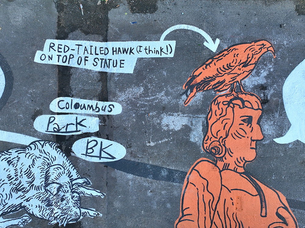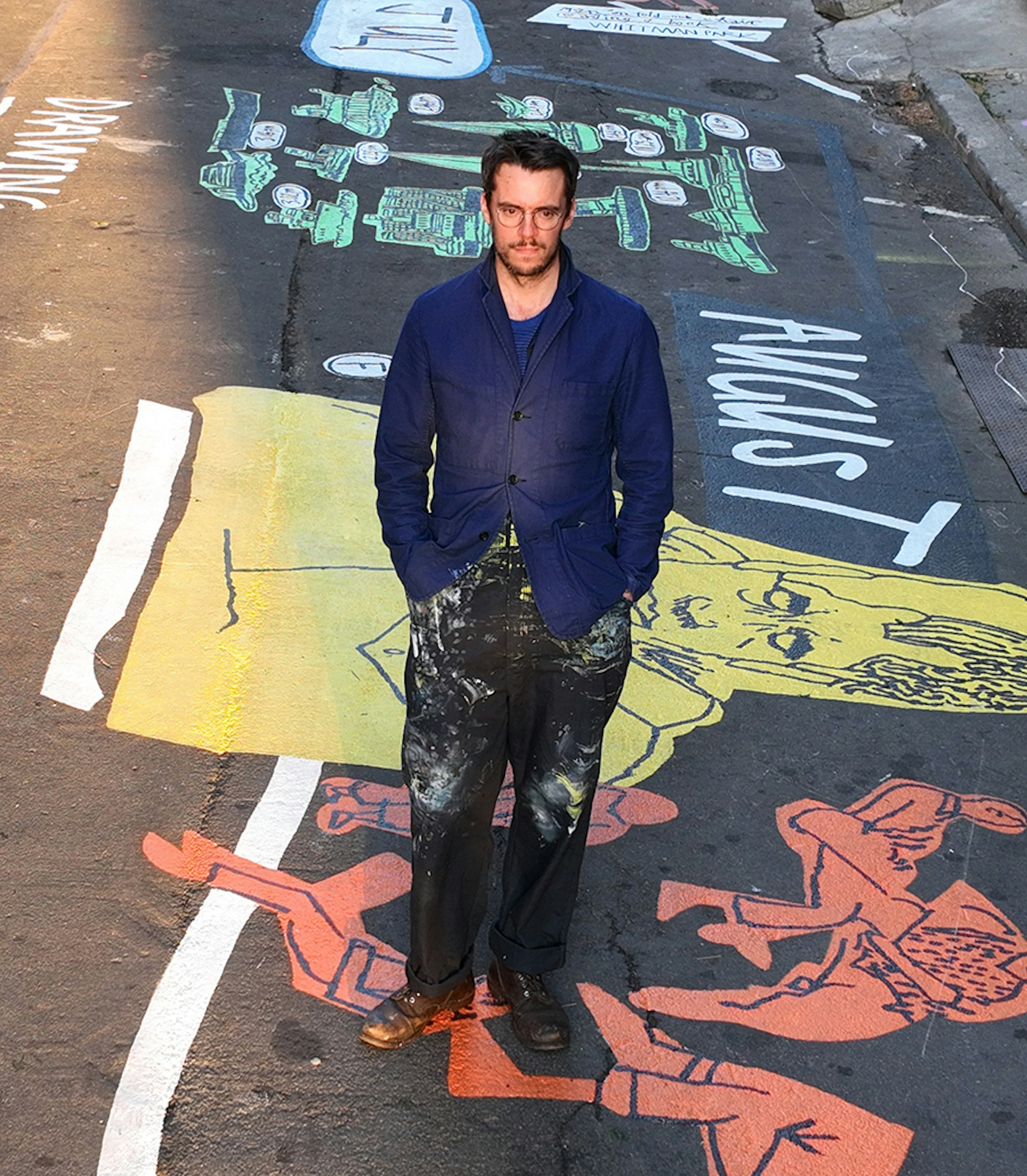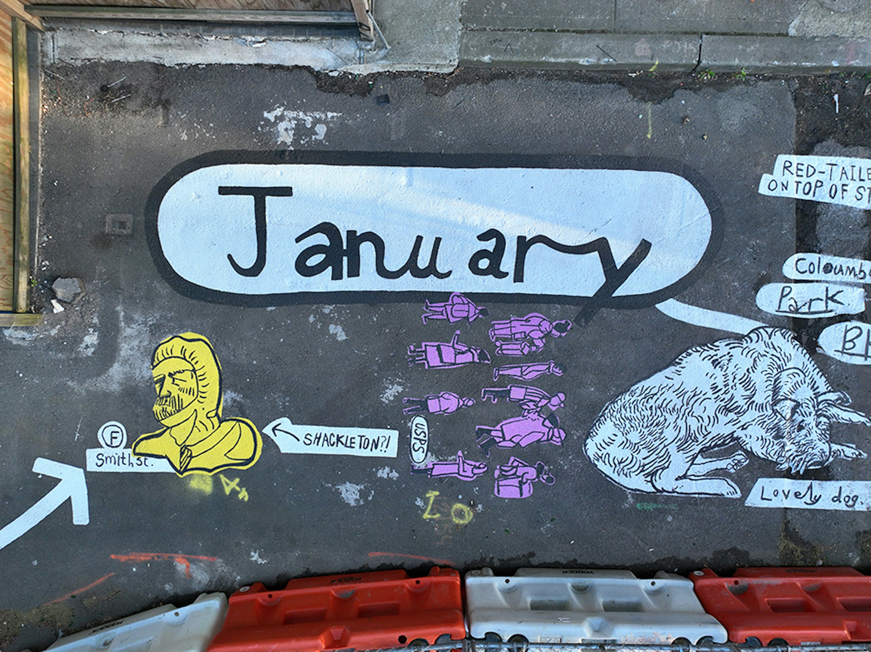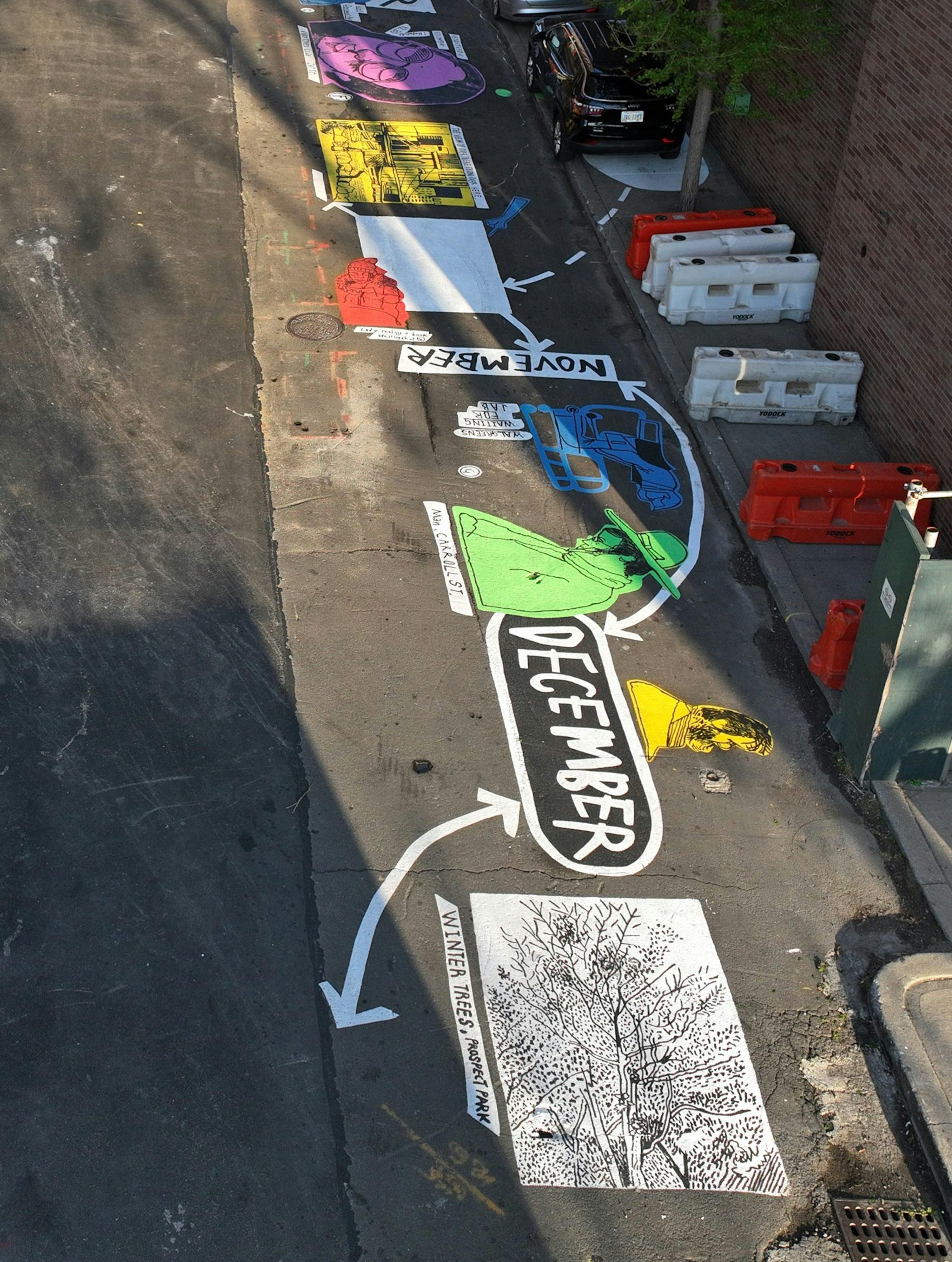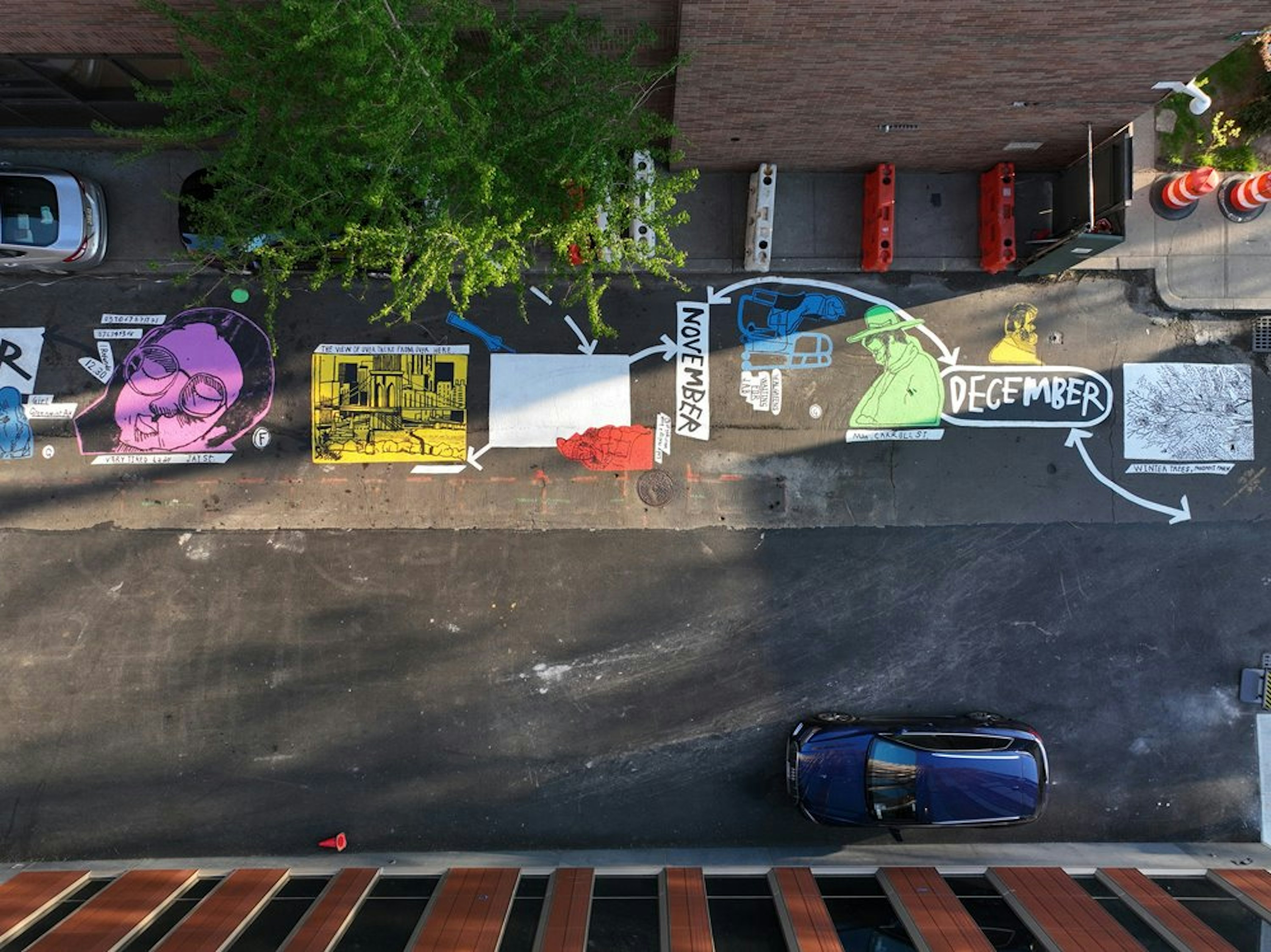 I was commissioned by Madison Realty Capital to create a temporary, city-block-long community mural in Cobble Hill, Brooklyn. Drawing from years of sketchbooks made in the surrounding neighbourhood(my studio is just a short walk away) I transformed everyday observations into a single, expansive painting. The mural was conceived as a giant Snakes and Ladders–style board, inviting children and families to move through it, play with it, and linger. Designed to be interactive, it includes dedicated areas for chalk drawings, allowing kids to add their own marks and record their own observations alongside the artwork.