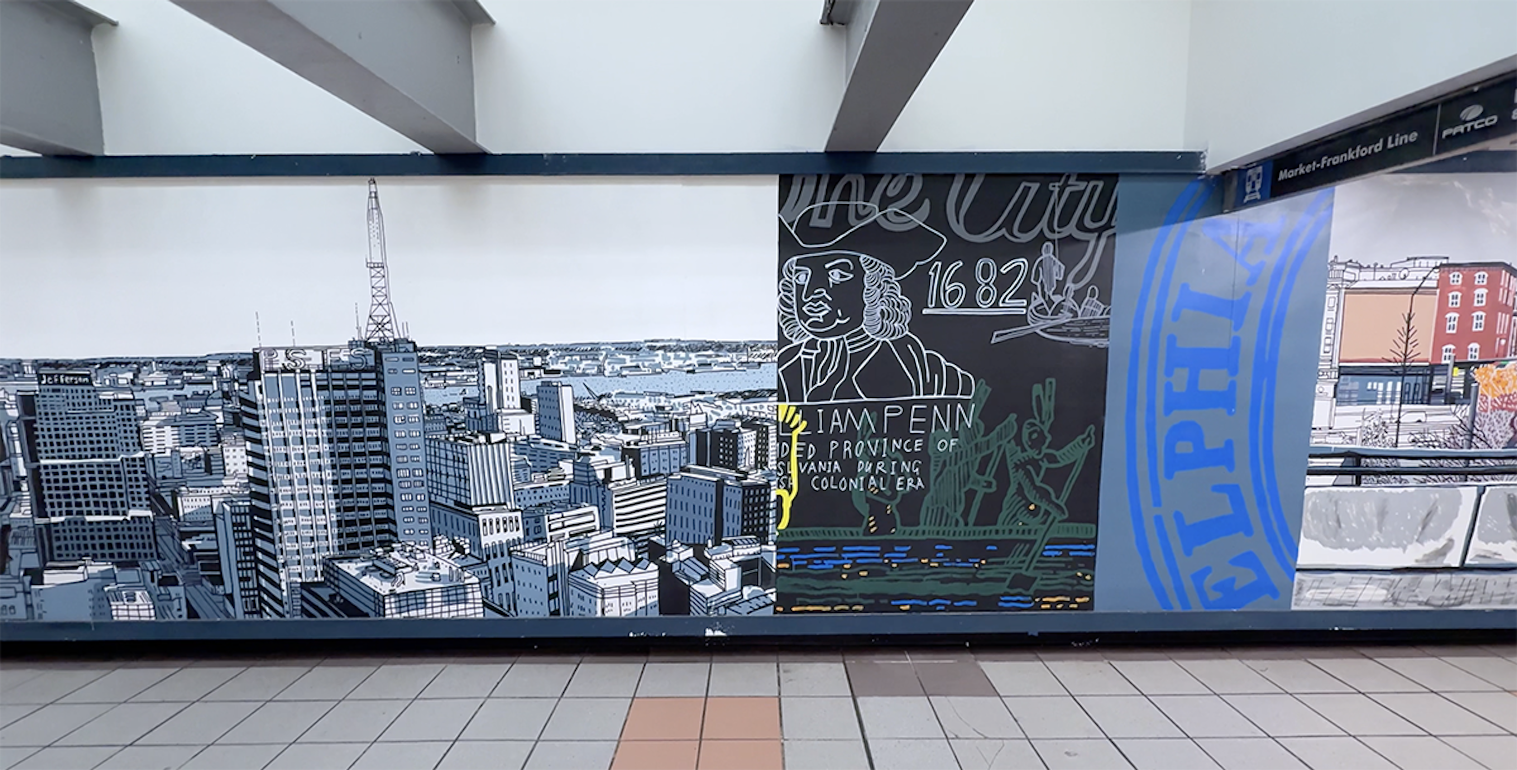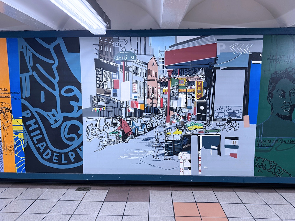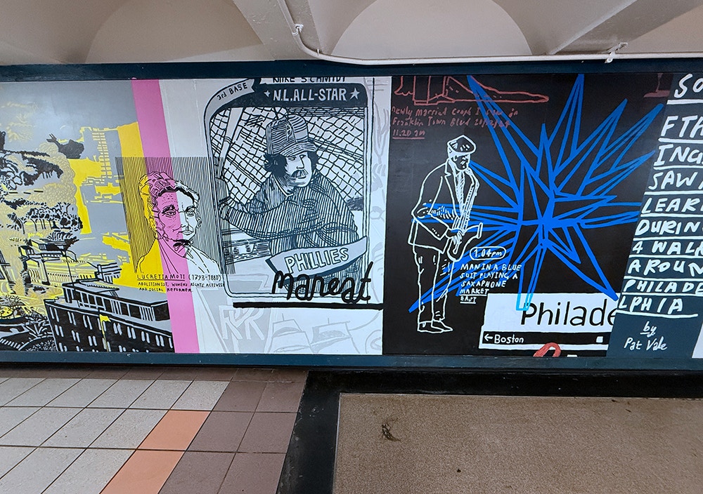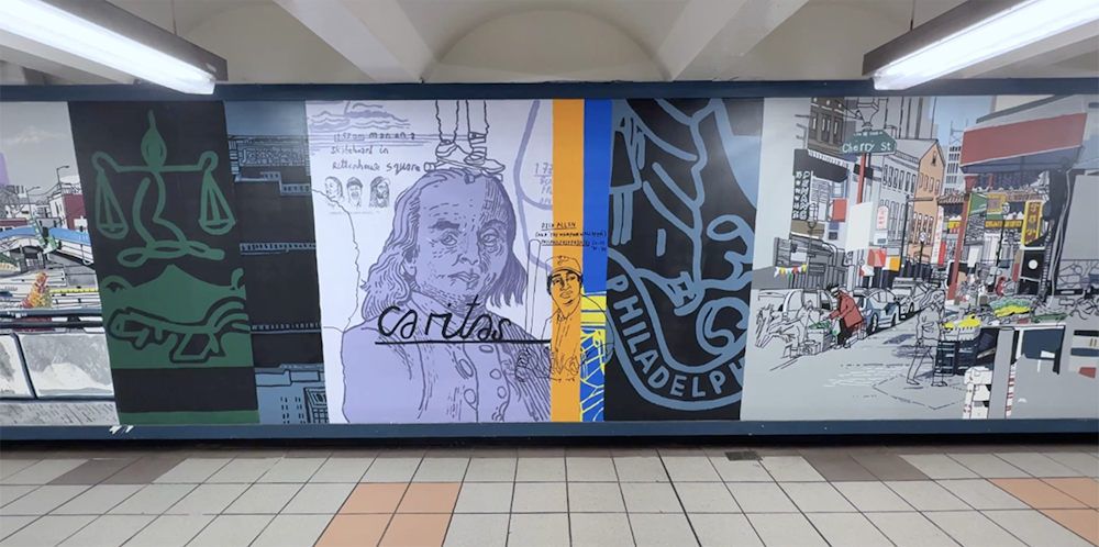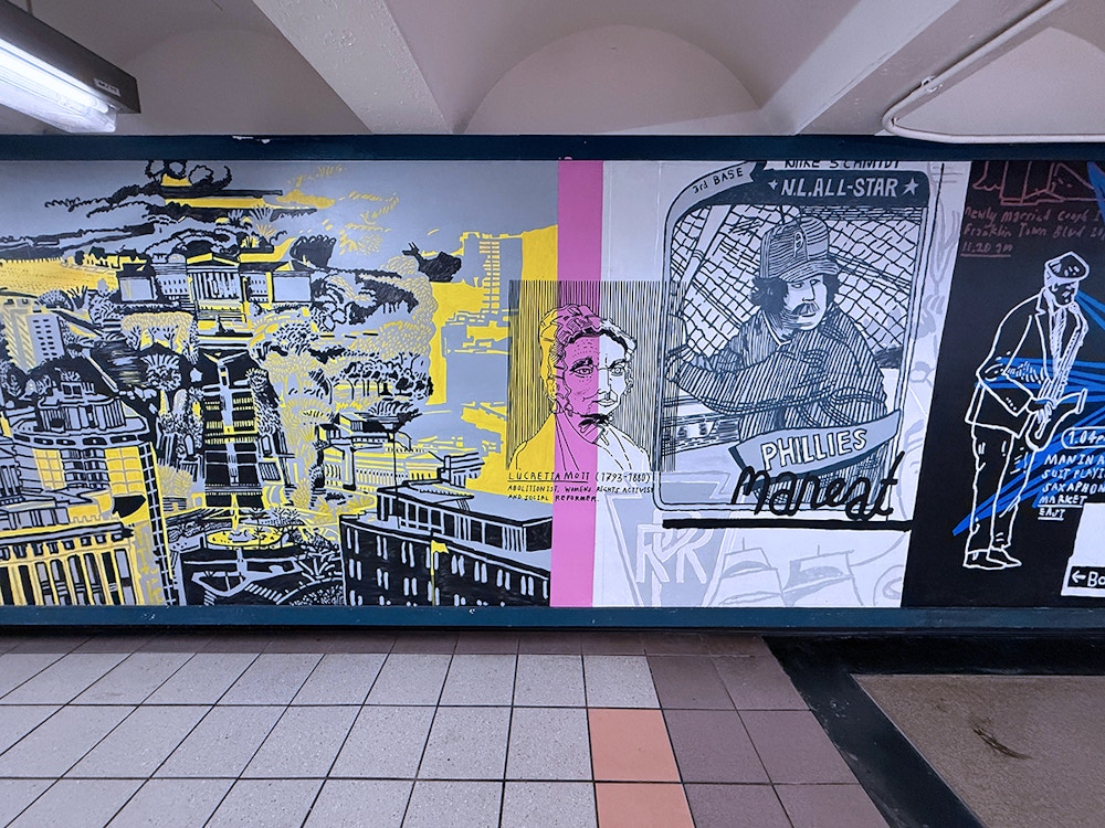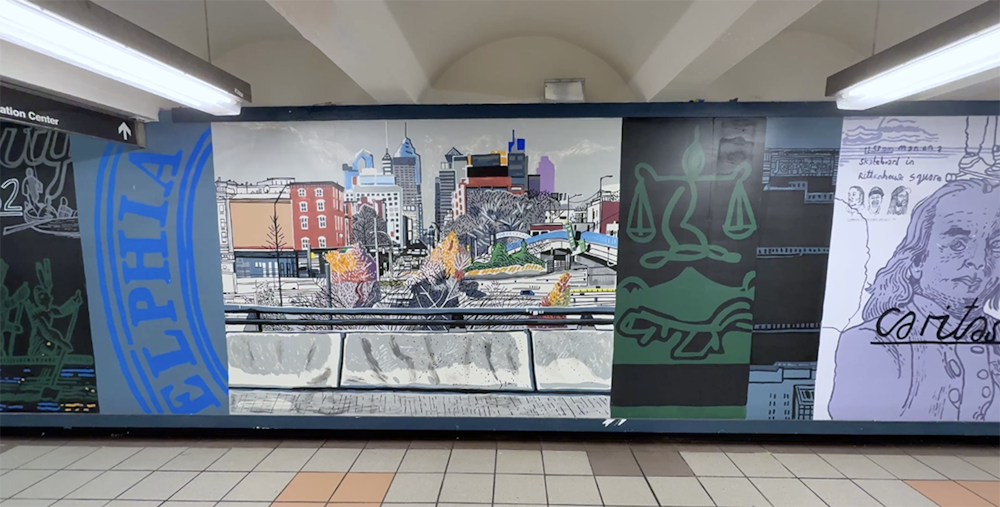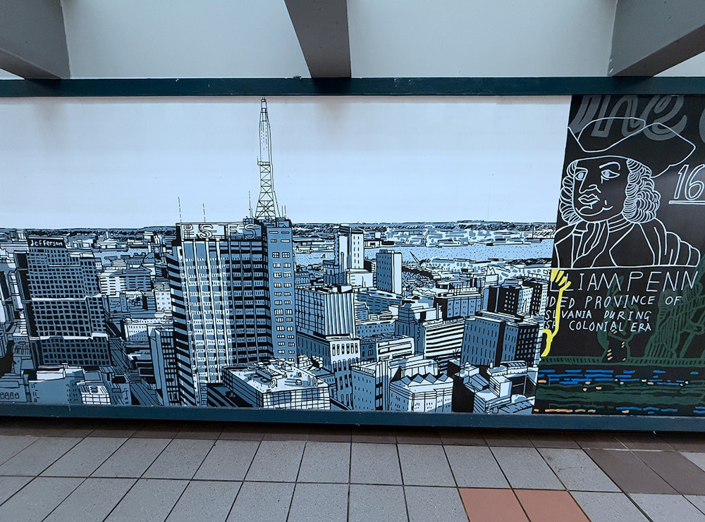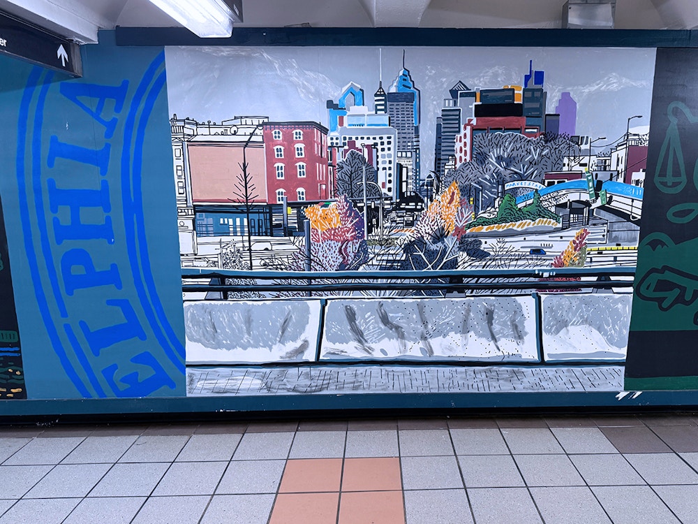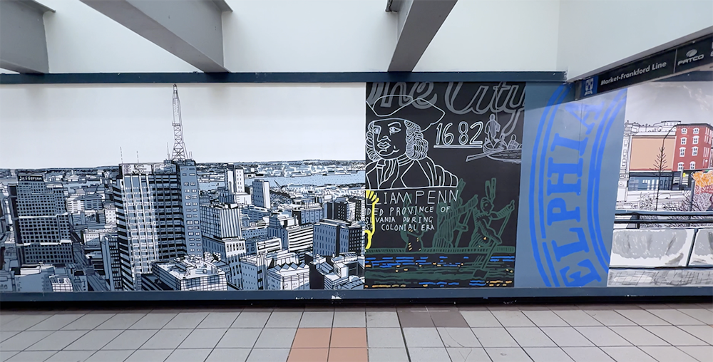 Painting in such a public space was a joy, fueled by conversations and encouragement from passersby, with invaluable support from the teams at SEPTA and PATCO. I hope the finished work reflects Mark’s vision and love for the city — its grit, humor, and heart — and the generosity with which it welcomed me.