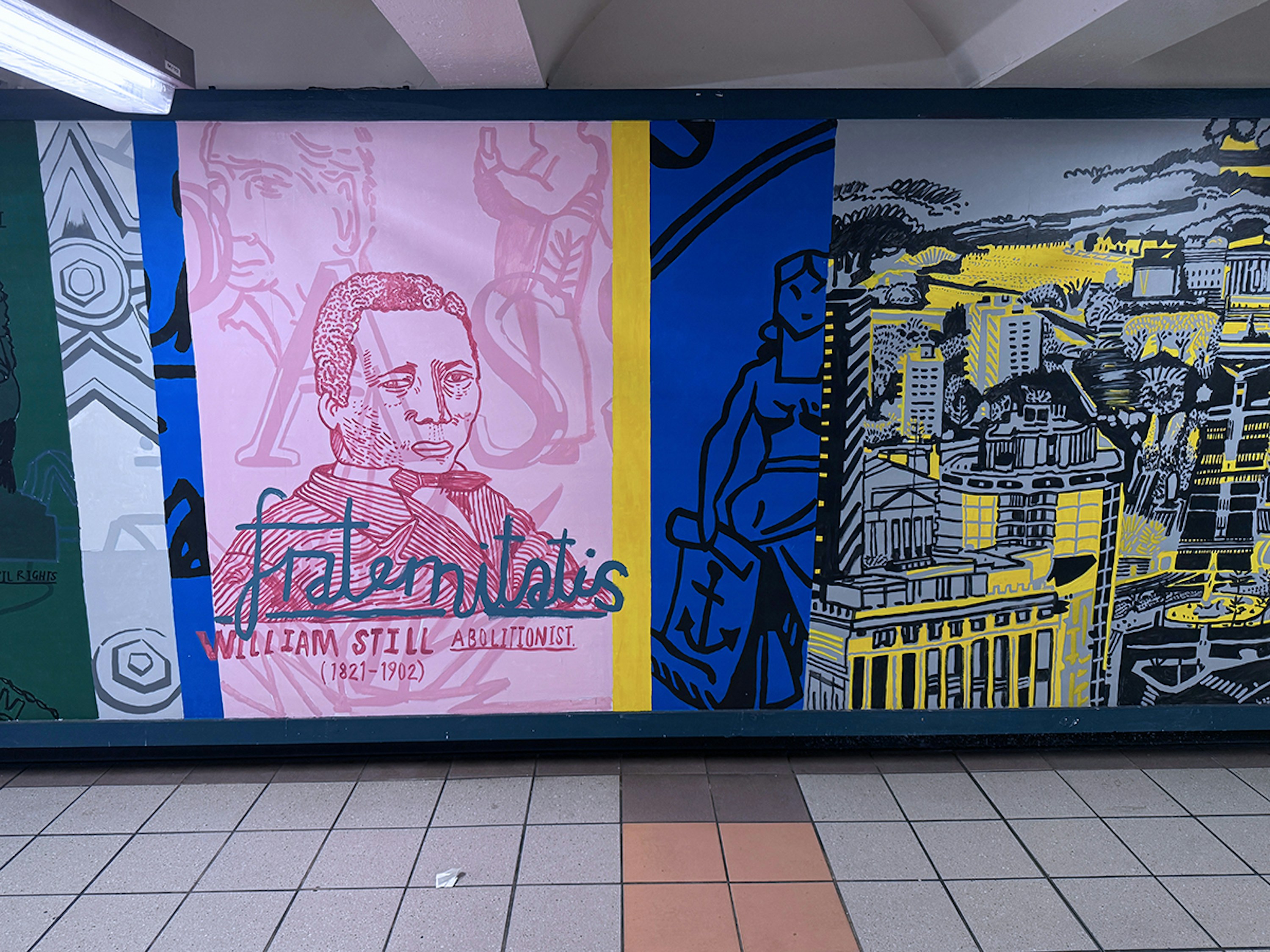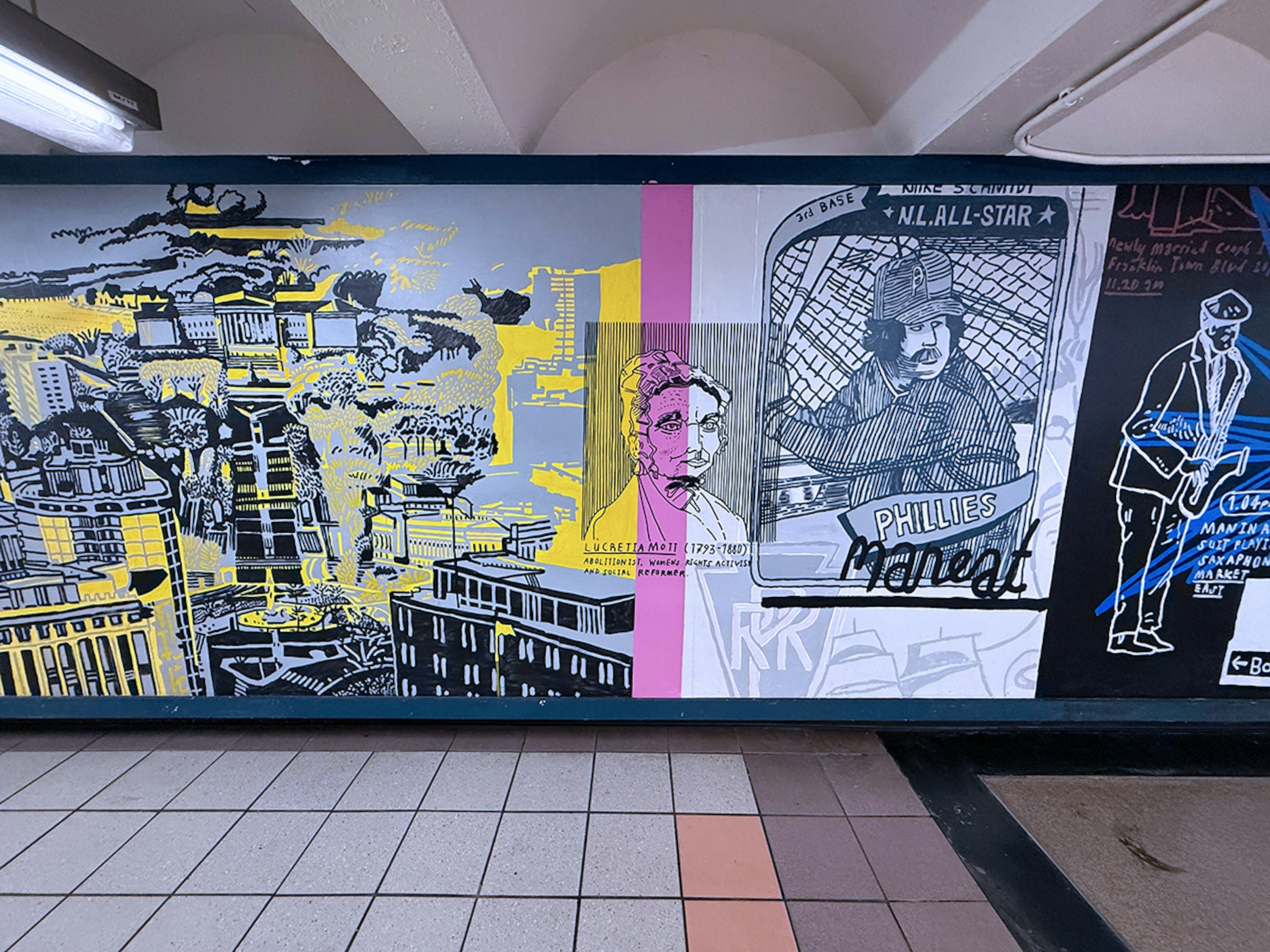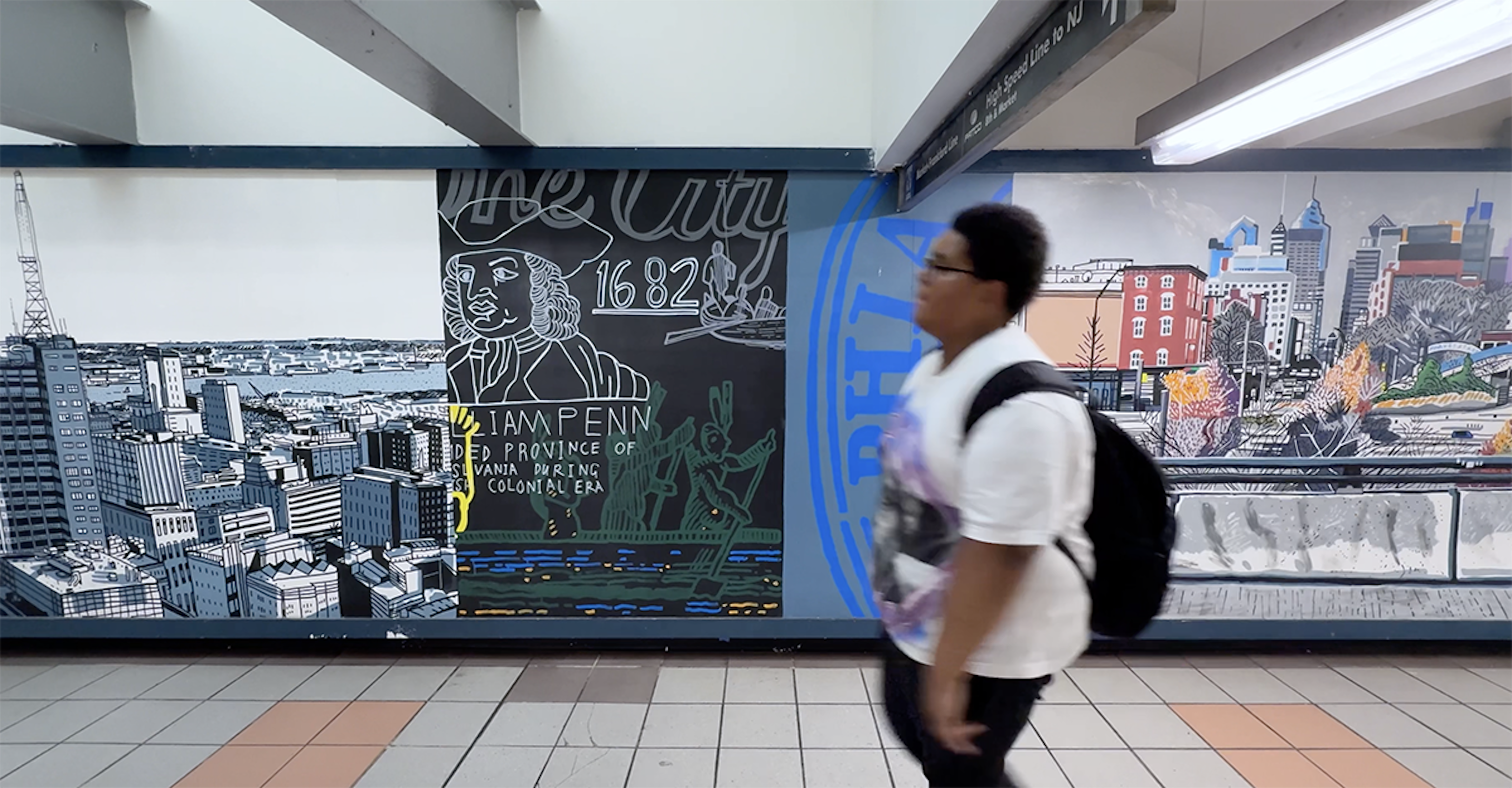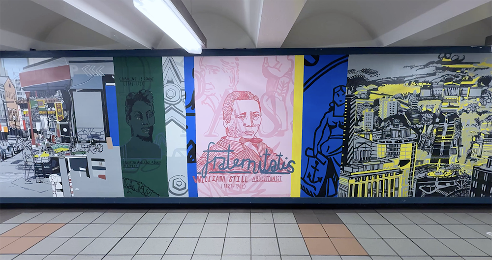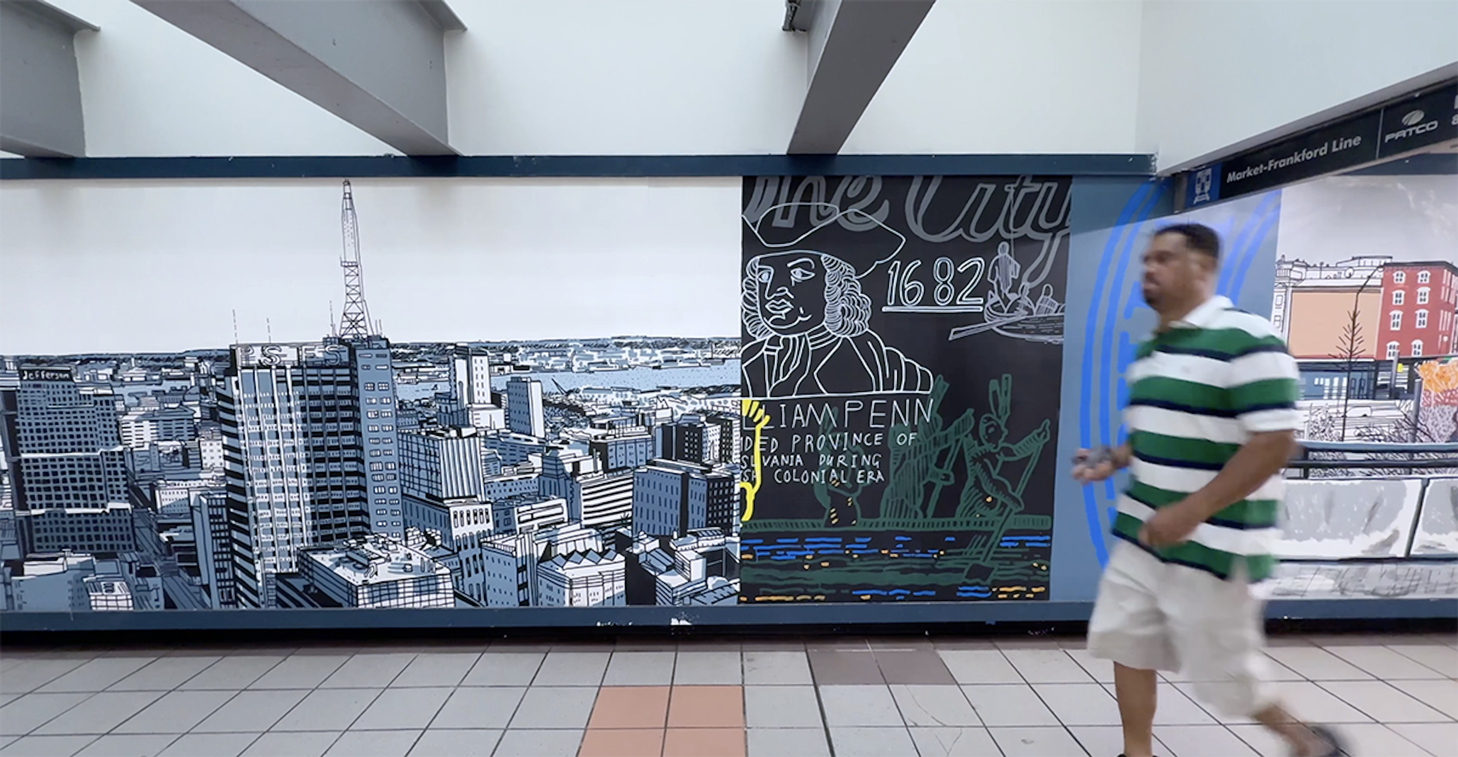 Painting in such a public space was a joy, fueled by conversations and encouragement from passersby, with invaluable support from the teams at SEPTA and PATCO. I hope the finished work reflects Mark’s vision and love for the city — its grit, humor, and heart — and the generosity with which it welcomed me.