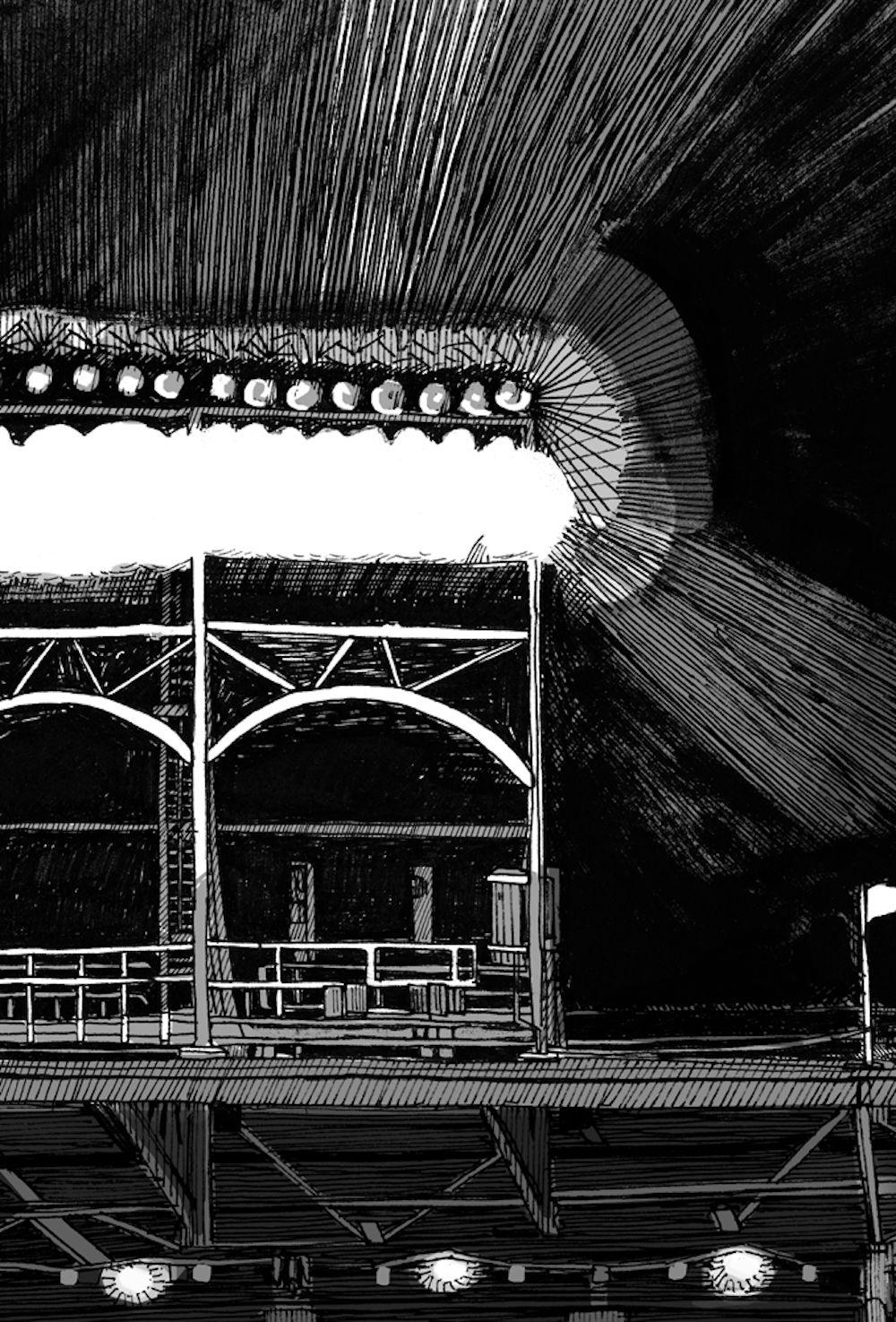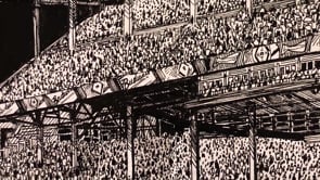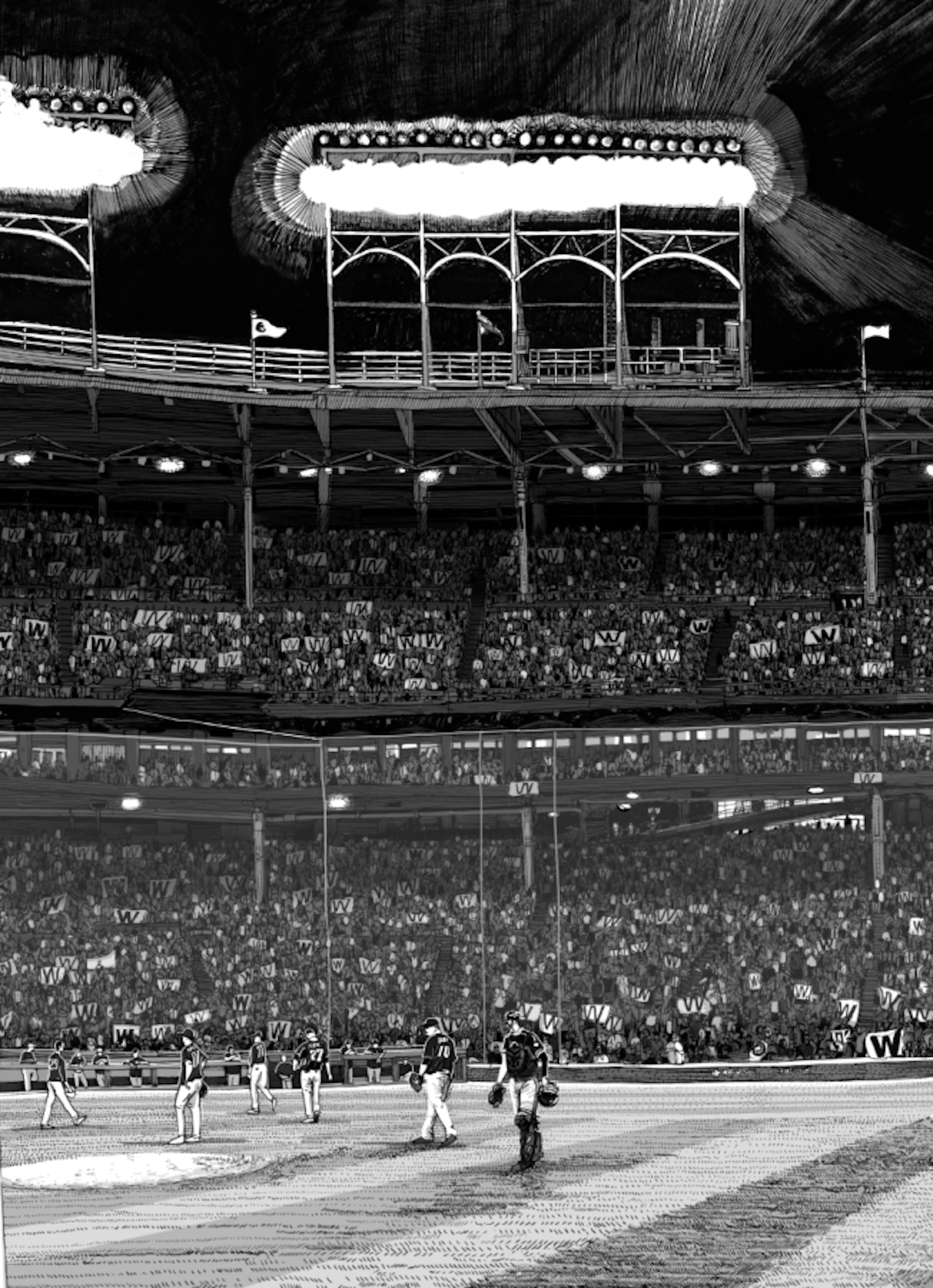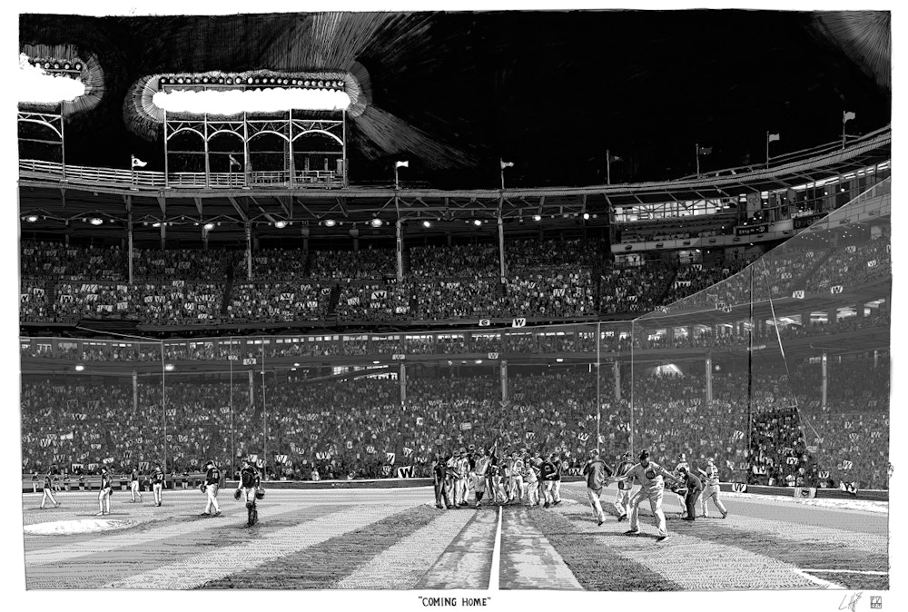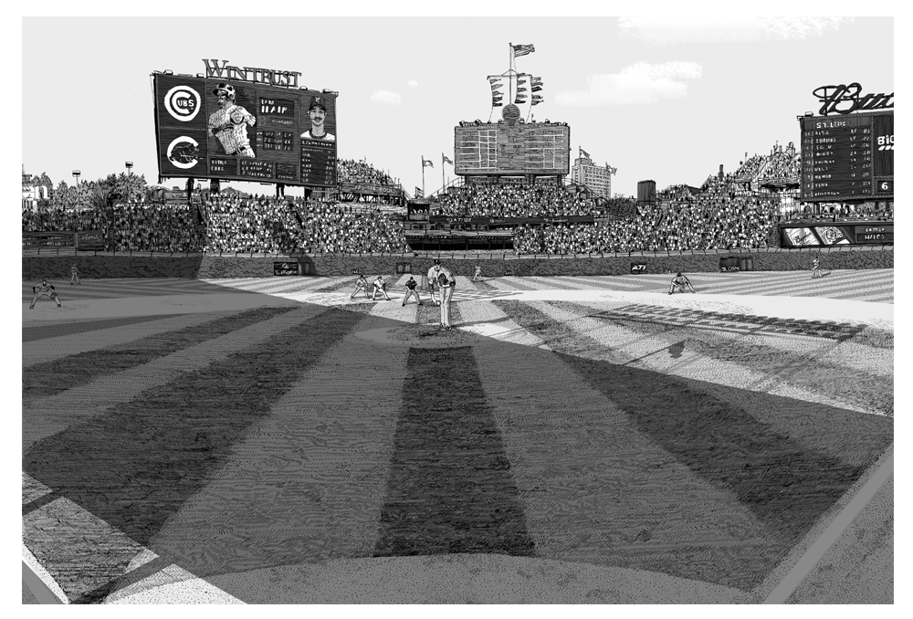 I initially collaborated with Chicago Cubs outfielder and Gold Glove winner Ian Happ on a series of three drawings created from his point of view during games, translating fleeting moments on the field into intricate, hand-drawn observations. Shaped by Ian’s deep passion for the club and the living history of the iconic Wrigley Field, the project explored the shifting perspectives, quiet pauses, and charged energy that define the experience of baseball from within. What began as a focused commission gradually expanded into a wider body of work and exhibition, as my research into the Cubs’ enduring relationship with the city of Chicago revealed a deeper story — one where architecture, memory, and civic identity intertwine, and where the ballpark becomes both stage and symbol within the urban landscape.