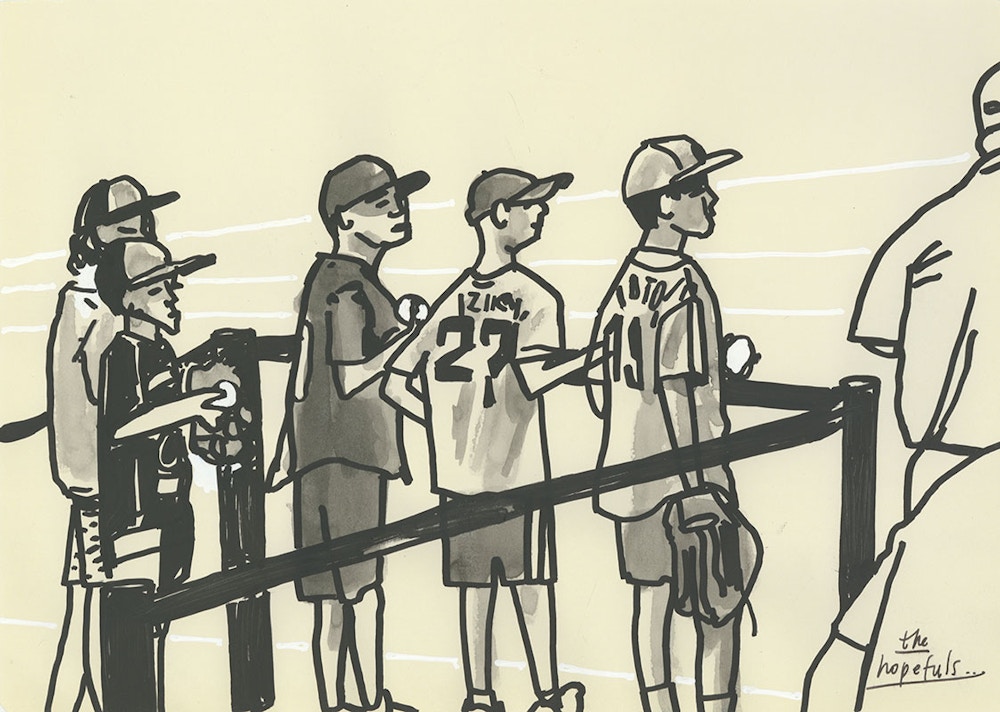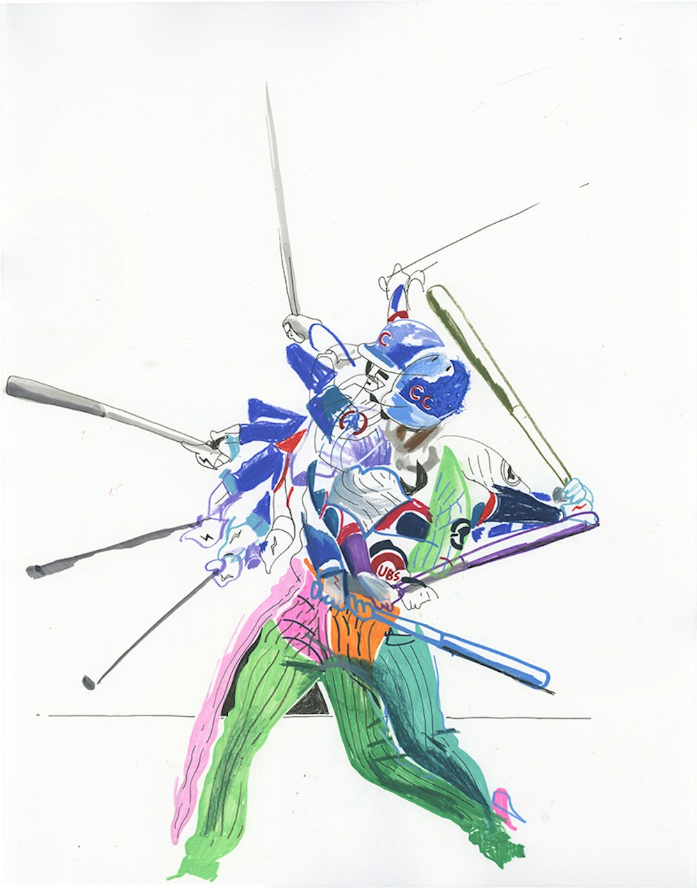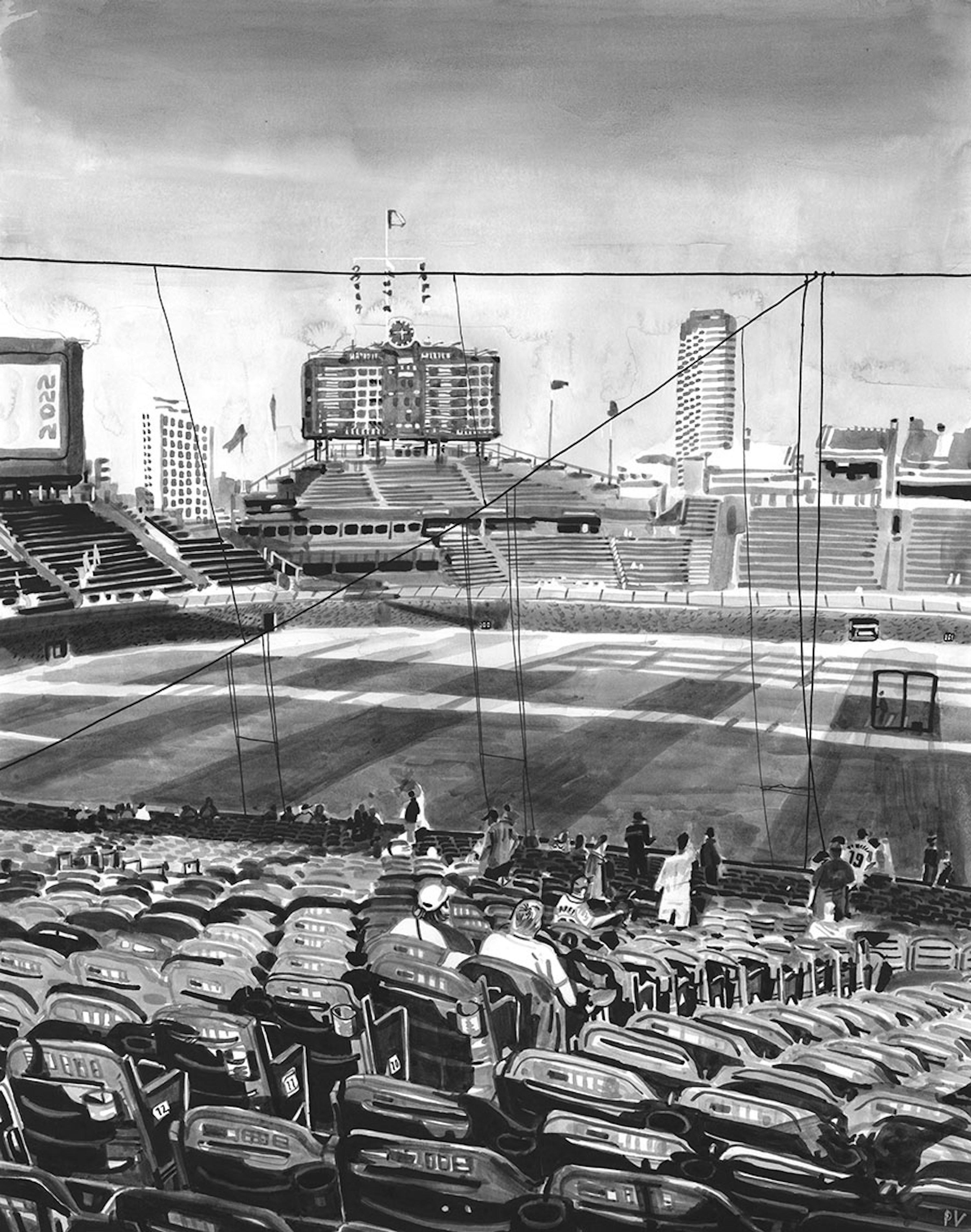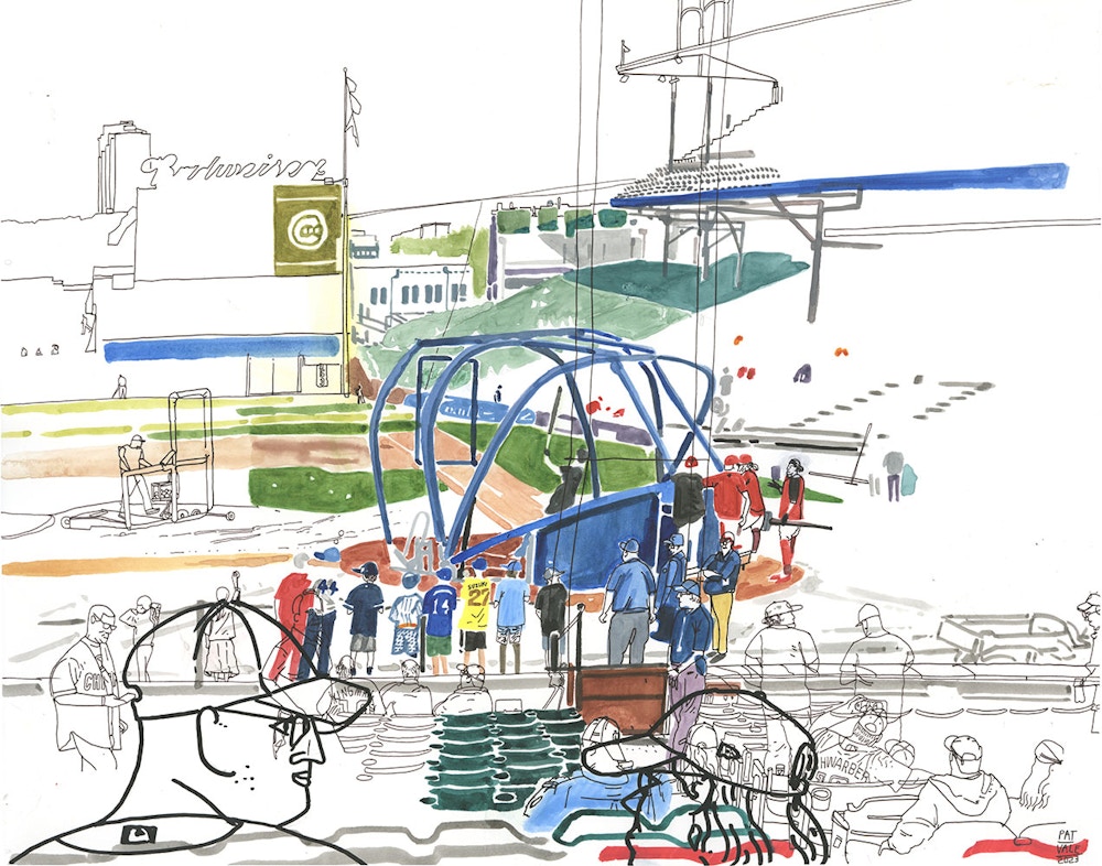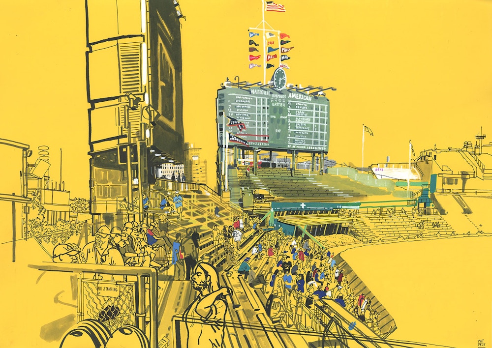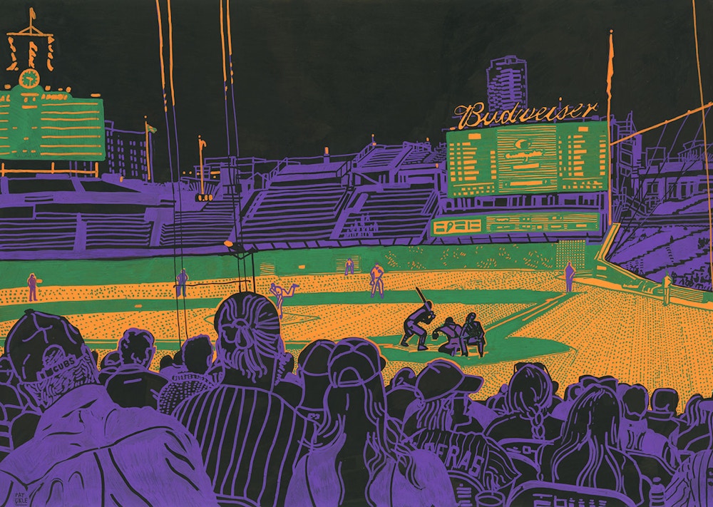 I initially collaborated with Chicago Cubs outfielder and Gold Glove winner Ian Happ on a series of three drawings created from his point of view during games, translating fleeting moments on the field into intricate, hand-drawn observations. Shaped by Ian’s deep passion for the club and the living history of the iconic Wrigley Field, the project explored the shifting perspectives, quiet pauses, and charged energy that define the experience of baseball from within. What began as a focused commission gradually expanded into a wider body of work and exhibition, as my research into the Cubs’ enduring relationship with the city of Chicago revealed a deeper story — one where architecture, memory, and civic identity intertwine, and where the ballpark becomes both stage and symbol within the urban landscape.
