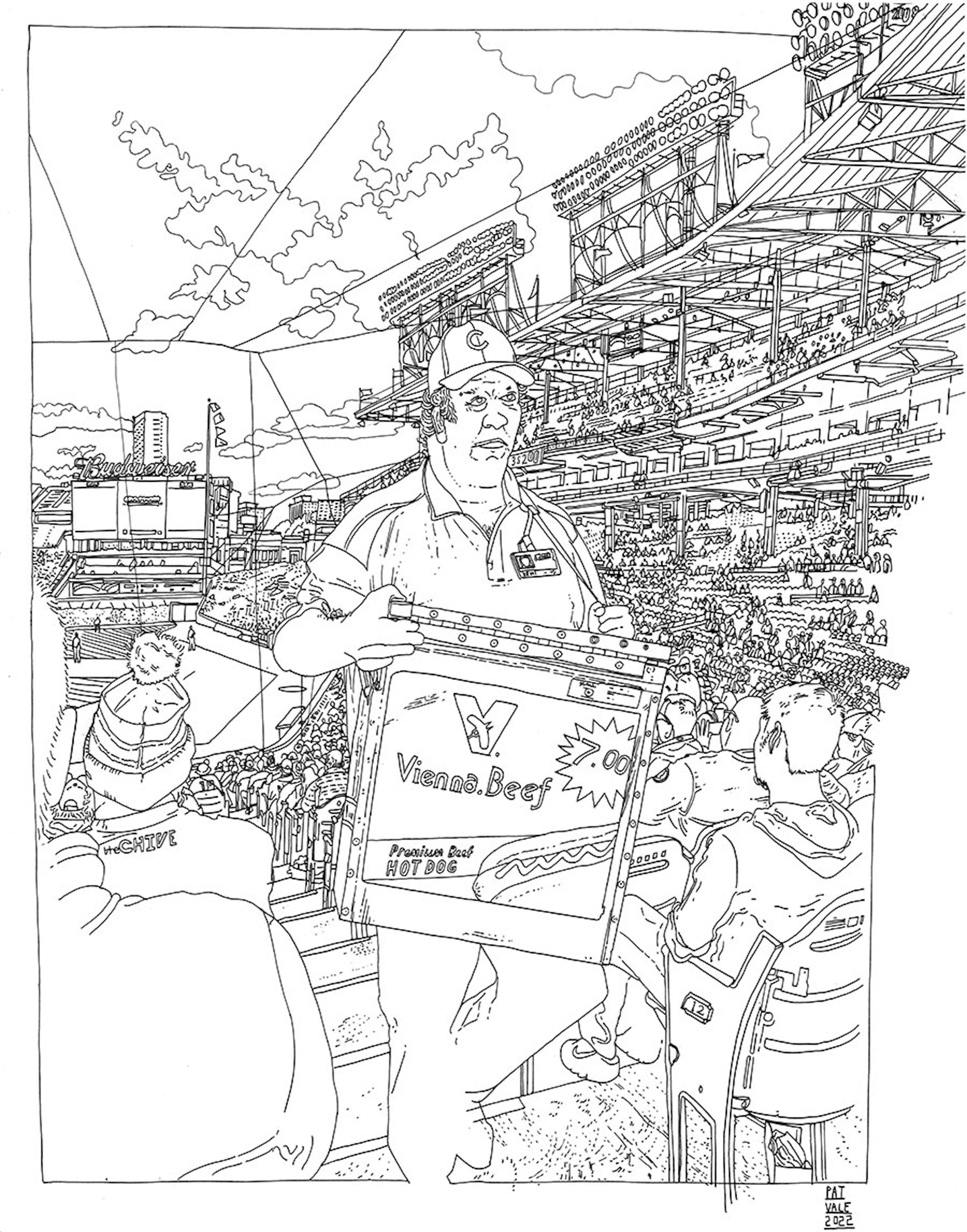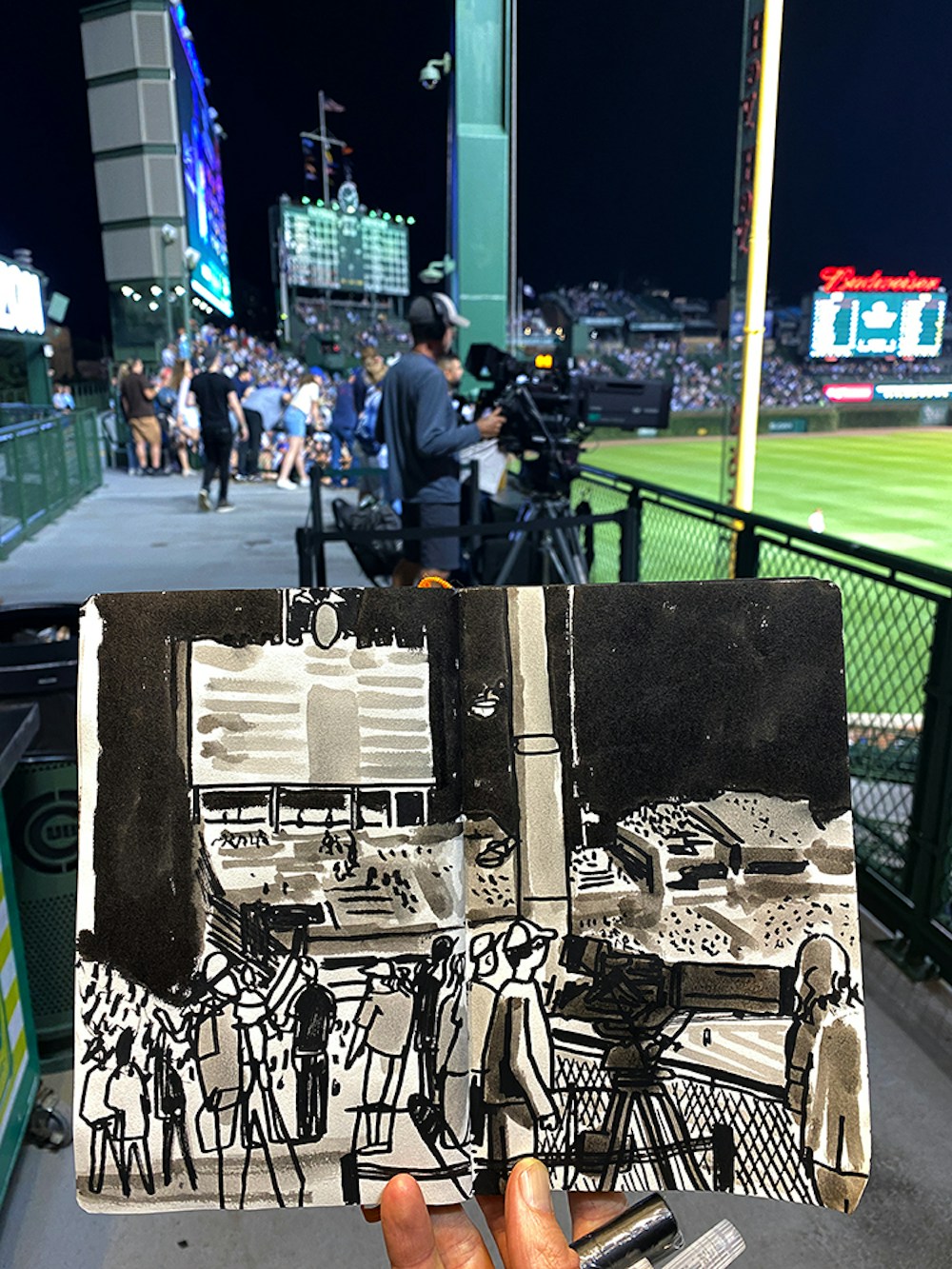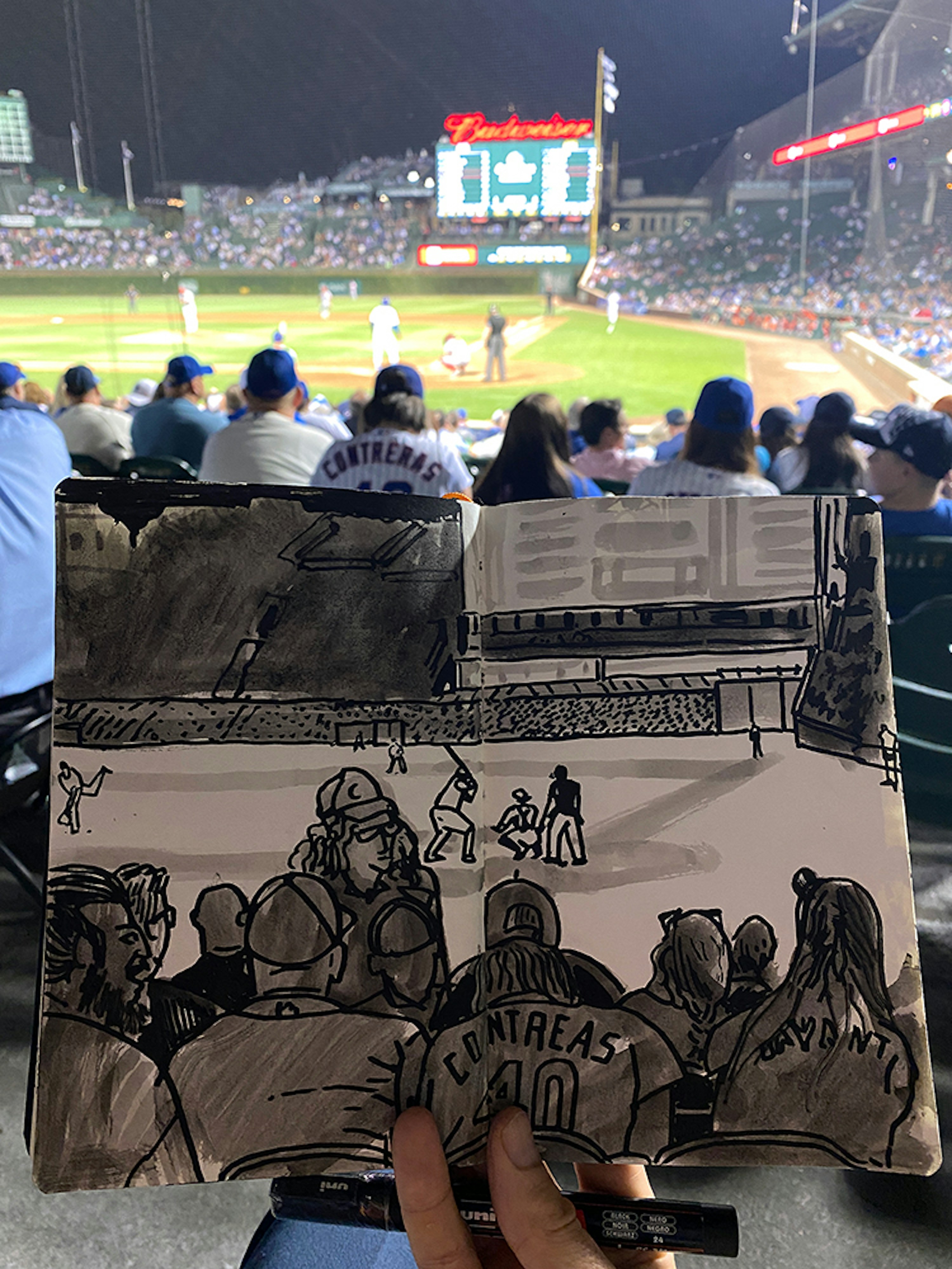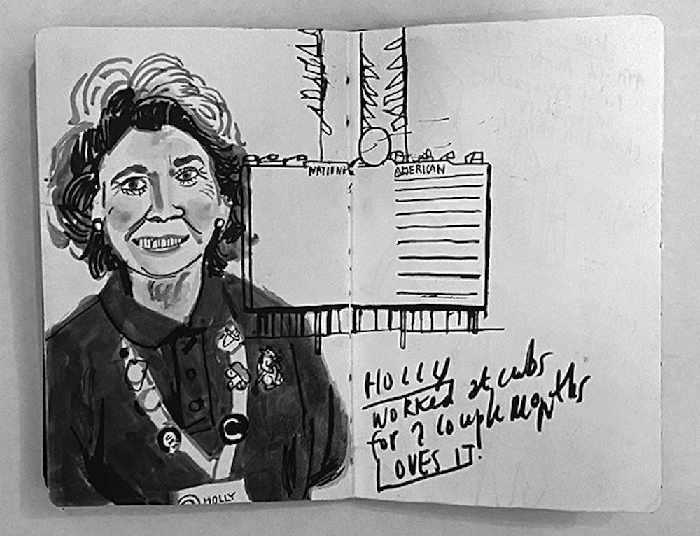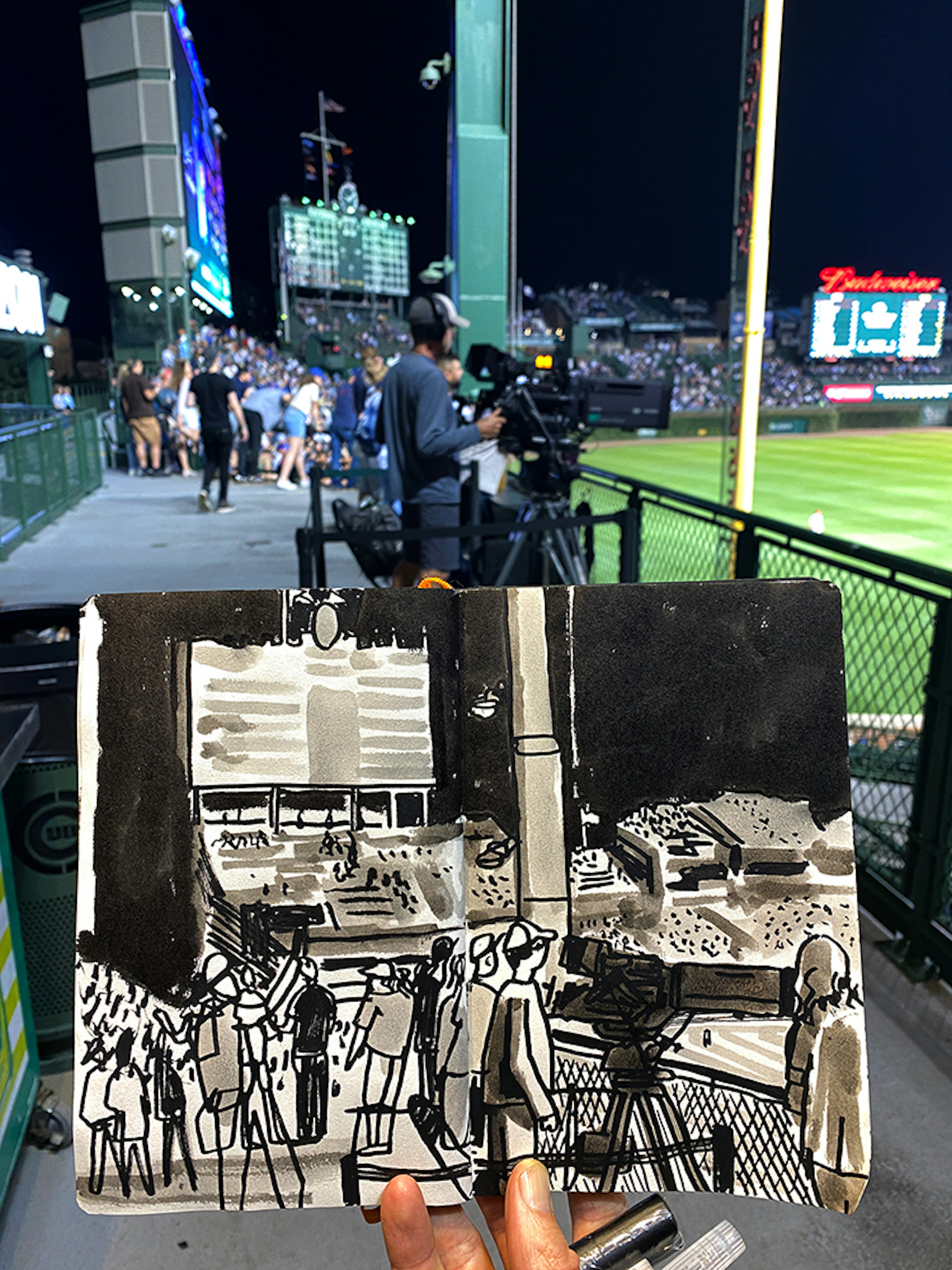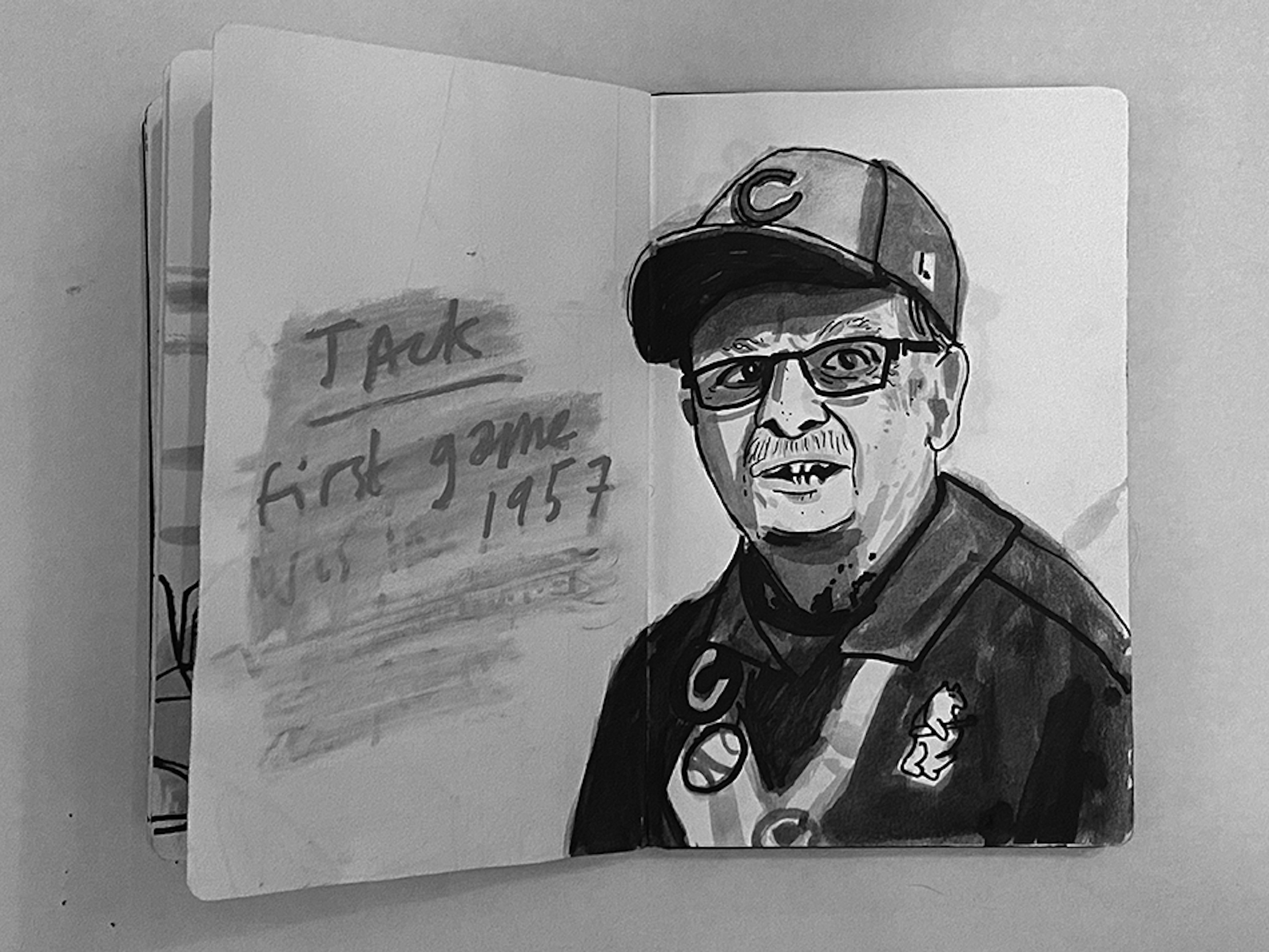 I initially collaborated with Chicago Cubs outfielder and Gold Glove winner Ian Happ on a series of three drawings created from his point of view during games, translating fleeting moments on the field into intricate, hand-drawn observations. Shaped by Ian’s deep passion for the club and the living history of the iconic Wrigley Field, the project explored the shifting perspectives, quiet pauses, and charged energy that define the experience of baseball from within. What began as a focused commission gradually expanded into a wider body of work and exhibition, as my research into the Cubs’ enduring relationship with the city of Chicago revealed a deeper story — one where architecture, memory, and civic identity intertwine, and where the ballpark becomes both stage and symbol within the urban landscape.